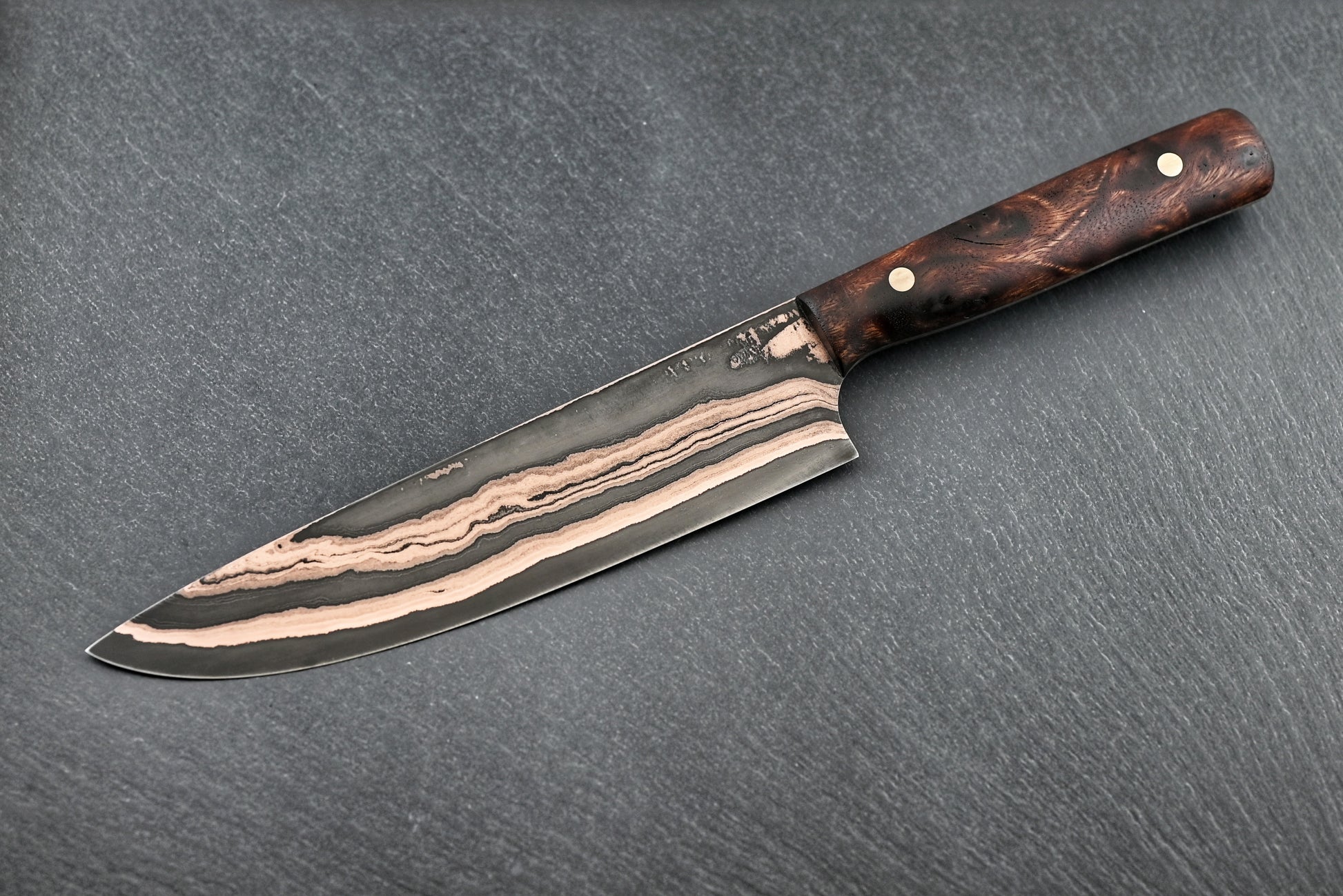 Ein handgeschmiedetes Chefmesser für anspruchsvolle Köche, die höchste Schneidleistung mit außergewöhnlicher Kupfer-Ästhetik in einem kompakten Format vereint haben möchten.