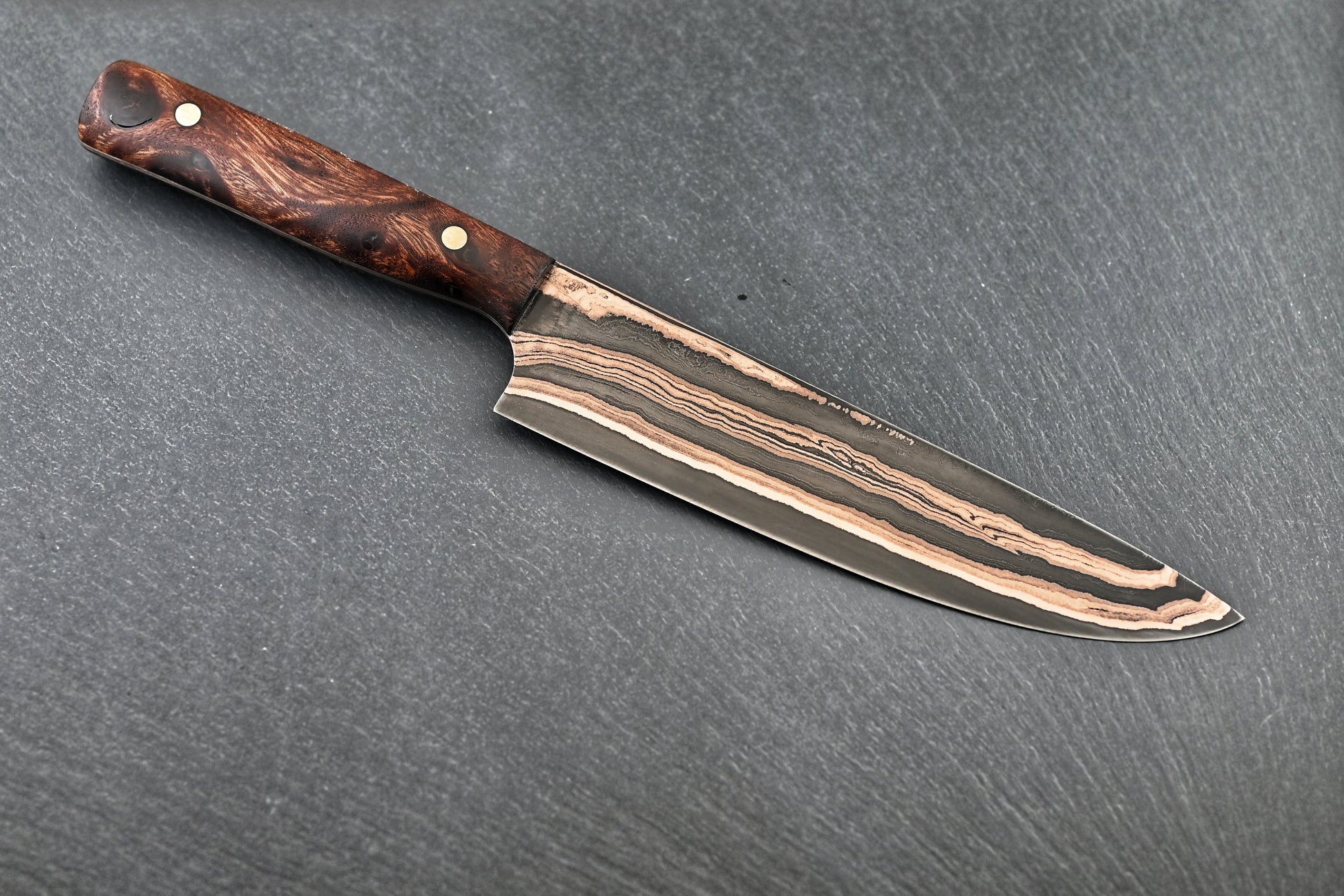 Ein handgeschmiedetes Chefmesser der Extraklasse. Die Kombination aus hochleistungsfähigem Apex Ultra Kern und Kupferdamast macht dieses kompakte Chefmesser zu einem außergewöhnlichen Werkzeug, das höchste Schneidleistung mit faszinierender Kupfer-Ästhetik vereint.