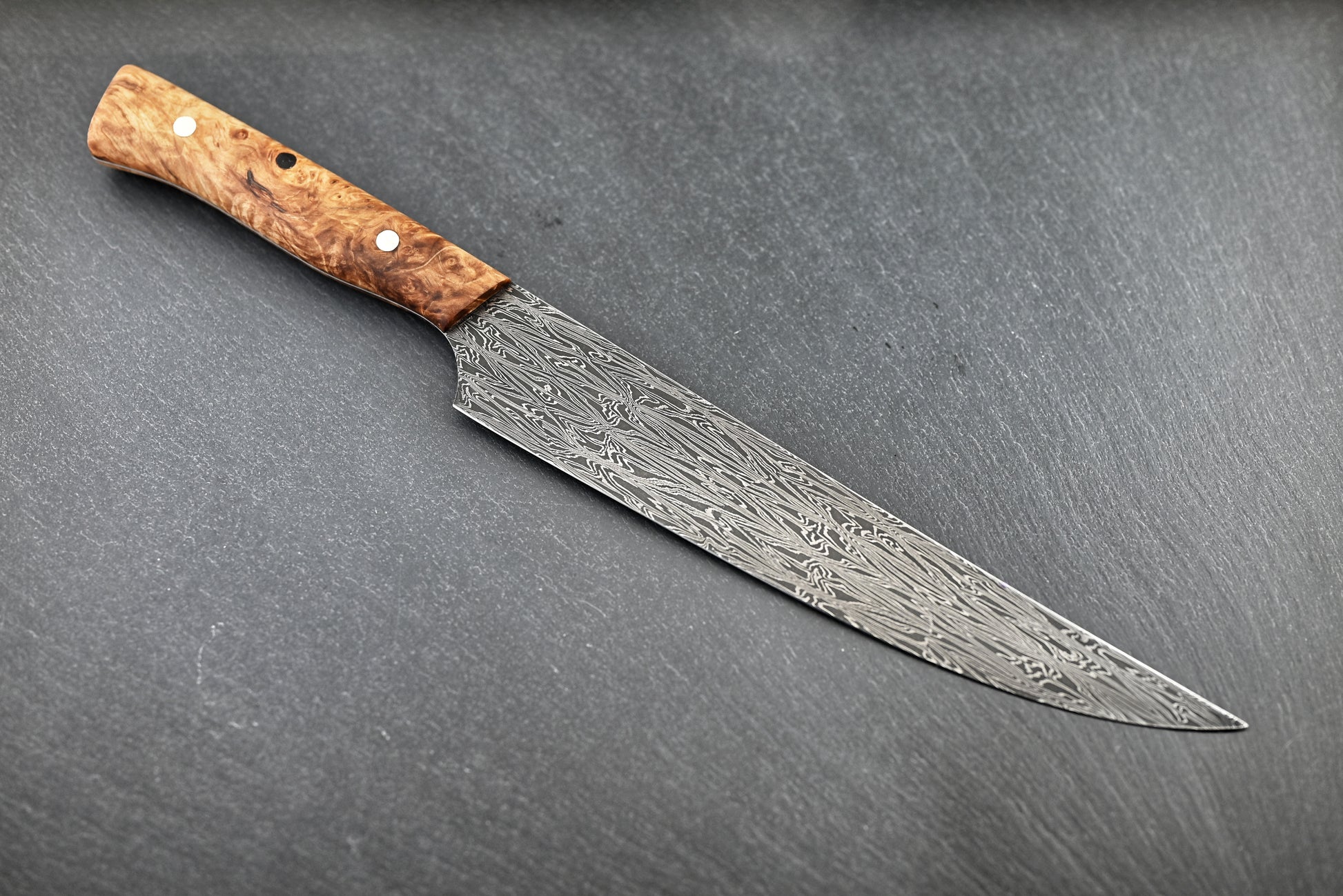 Stabilisierte Maserbirke: Das Holz mit seiner wilden, unregelmäßigen Maserung wird durch das Stabilisierungsverfahren dauerhaft gefestigt und versiegelt. Das Ergebnis ist ein Griff, der nicht nur außergewöhnlich aussieht, sondern auch bei Feuchtigkeit formstabil und langlebig bleibt – ideal für den Einsatz mit Fisch und feuchtem Schnittgut.
